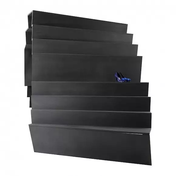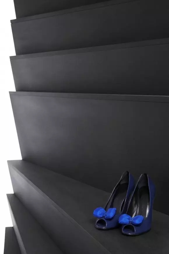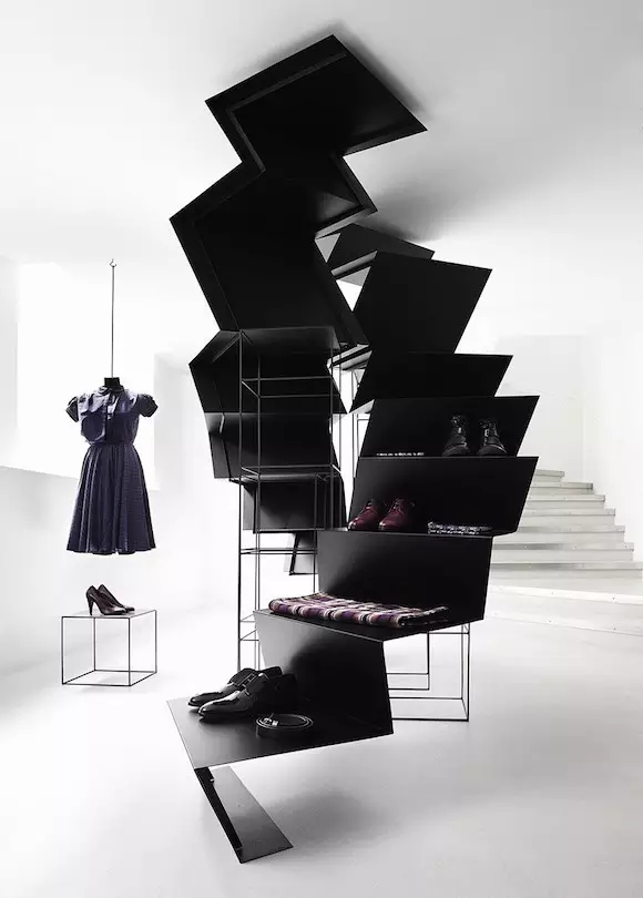 在店的正中央,鞋子、絲巾、皮帶等配飾都被按階梯擺在一個旋轉(zhuǎn)的“樓梯”裝置上,得到了獨立和全面的展示。因為“奇怪”的造型,這個樓梯從各個角度看都會呈現(xiàn)不同的面貌,使得門店變得與眾不同。而其盤旋上升的結(jié)構(gòu),泉州貨架廠的設(shè)計也使得整家門店的縱向空間實現(xiàn)了視覺上拉伸放大的效果。