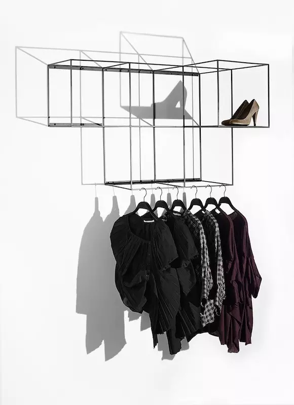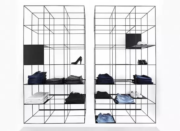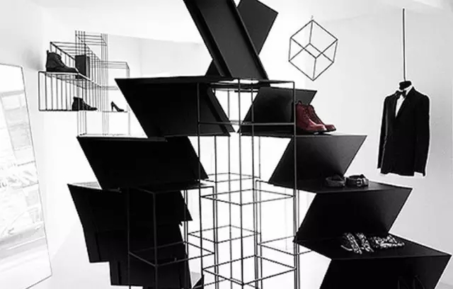除了樓梯,門店中還擺了幾個鋼絲做成的泉州貨架廠貨架,他們或被懸在空中,或組合成片安于墻上,也有不少直接放在了地上。鋼絲和各個立方體的頂面都可以被充分利用來展示貨物,比如鋼絲可以用作掛衣架的竿子,而頂面則可以擺放鞋子、項鏈等配飾。同時,這些鋼絲貨架也是門店非常特別的裝飾物——什么也不擺,也是一種好選擇。
