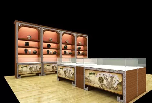 展柜是保護(hù)和凸起重要的道具,展柜類通常有立柜(靠墻陳設(shè))、中央立柜(四面玻璃的中央柜)和桌柜(書桌式的平柜,上面附有水平或有坡度的玻璃罩),布景箱等。現(xiàn)在常用的裝配式高立柜和中央立柜,垂直與水平構(gòu)件上有槽溝,可插入玻璃;也有的用彈簧鋼卡夾裝玻璃,假如放置在墻邊,一邊可以只裝背板,不許安裝玻璃。有的高立柜的頂部還可以放置照明燈泡。桌柜通常有平面柜和斜面柜兩種,斜面又有單斜面和雙斜面之分:?jiǎn)涡泵嫱ǔ?繅Ψ胖?,雙斜面則放置在展廳中心。桌柜的通常高度是:平面柜的總高為105—120厘米;斜面柜總高為140厘米左右;柜長(zhǎng)為120—140厘米;進(jìn)深70—90厘米;柜內(nèi)凈高20—40厘米。布景箱只供一個(gè)方向觀看,類似櫥柜的和龕櫥式大展柜,內(nèi)部可以設(shè)置各種場(chǎng)景,使展品呈現(xiàn)一個(gè)“真實(shí)”的環(huán)境中,使展示更加生動(dòng)。布景箱一般高度為180—15厘米,或者更高;深度90—150厘米以上,長(zhǎng)度可根據(jù)實(shí)際需要確定。布景箱的背部和頂部?jī)蓚?cè)應(yīng)設(shè)計(jì)成弧形,以造成看見深遠(yuǎn)的感覺。為保證布景的真實(shí)效果,大型布景箱的深度至少應(yīng)為寬度的1/2以上,在照明的設(shè)計(jì)上也應(yīng)有所側(cè)重,以凸起展品的效果。