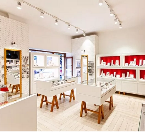 展示柜的燈光設計首先來自頂部光源,展示柜內(nèi)側(cè)多采用日光燈照明以提高整體亮度,另外,柜臺前側(cè)左右兩角多安裝冷光射燈和LED燈做為補充光源,以提高產(chǎn)品的立體感,特別是珠寶展示柜,通過角部射燈或LED燈的照射反射出,鉆石特有的棱角質(zhì)感,從而激發(fā)顧客的購買欲.珠寶店所賣的商品都比較名貴,而且要突出晶瑩剔透的效果,眩目的效果更能襯托珠寶的高貴品質(zhì)還有就是要簡約大方,畢竟吸引顧客目光的必須是珠寶,而不是其他的裝飾點綴品.